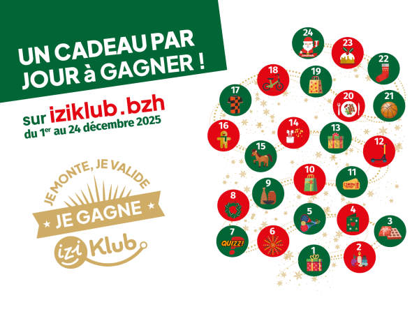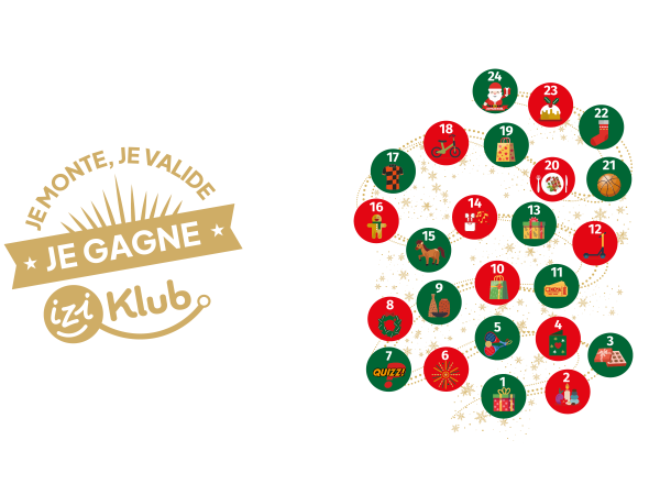Du lundi 1er au mercredi 24 décembre 2025, ouvrez chaque jour gratuitement une case du calendrier de l’Avent IziKlub et découvrez quel cadeau vous pouvez gagner !