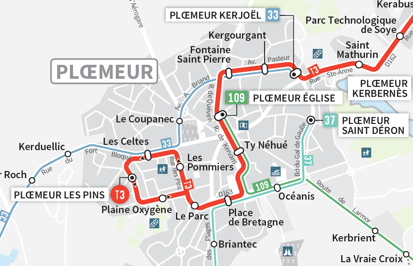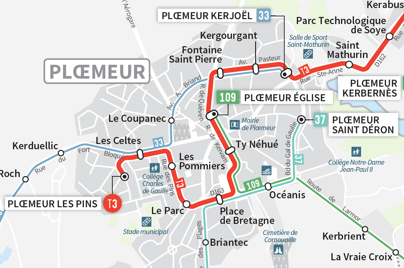 - Les arrêts "Les Pommiers" et "Les Celtes" sont desservis uniquement en direction de PLŒMEUR Les Pins.