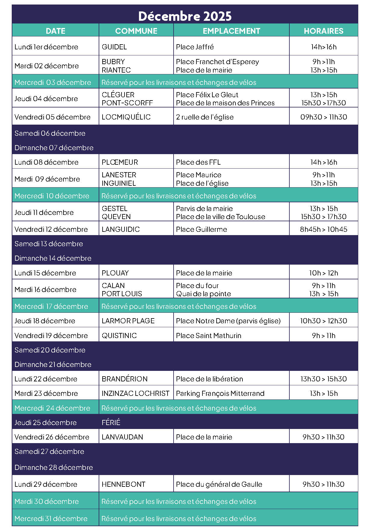 * Pas de livraison à domicile. Merci de consulter les adresses des points de permanence par commune dans le calendrier ci-dessus ou de vous rendre à la Maison du vélo de Lorient : 10 rue Victor Massé - 56100 Lorient.